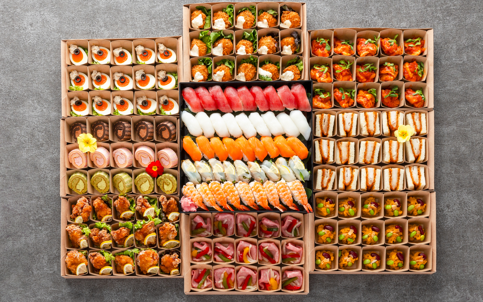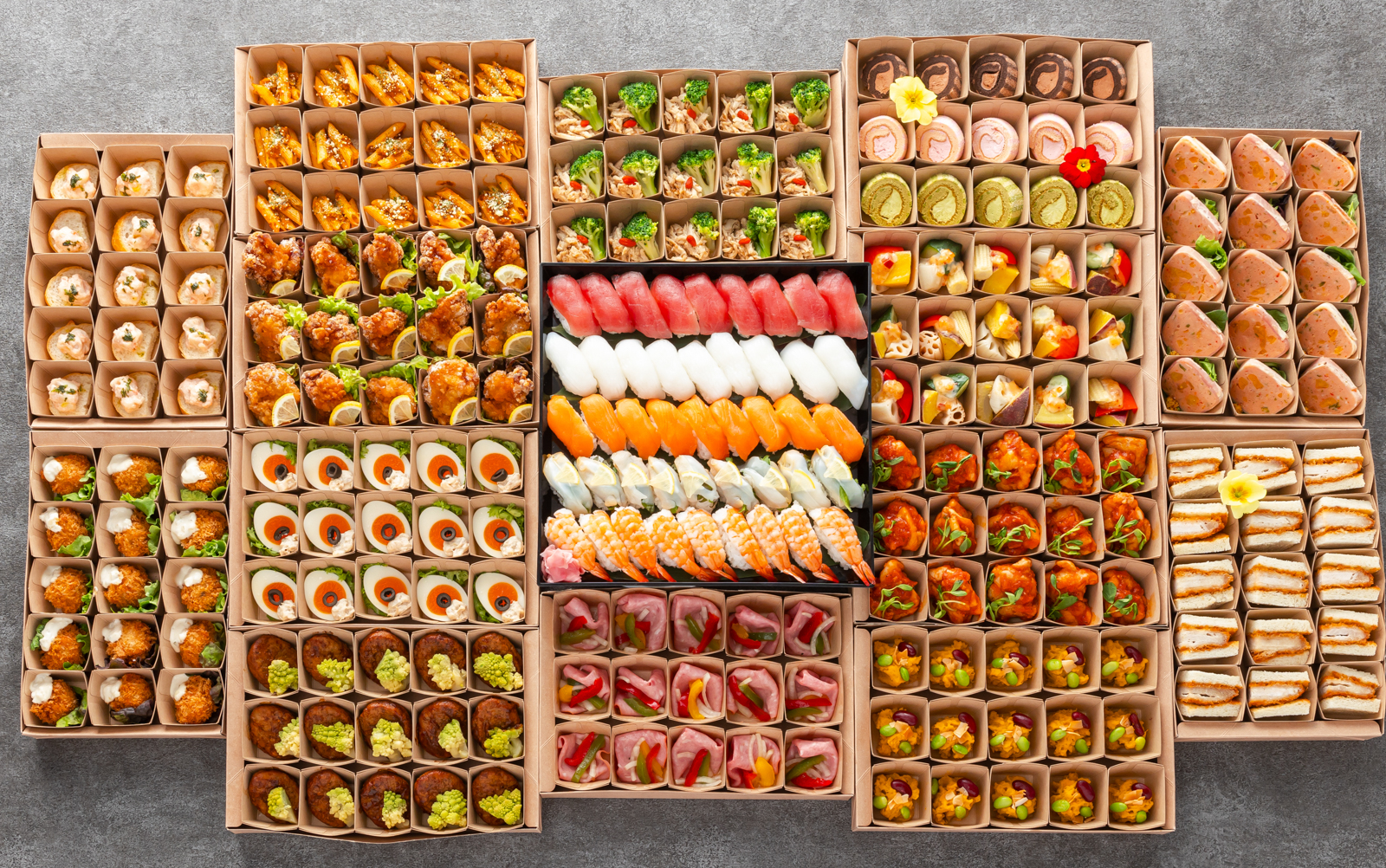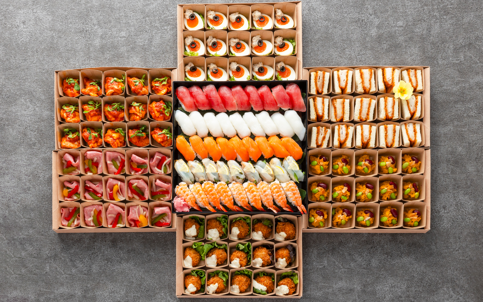 【握り寿司付】おもてなしにや交流会にも最適プラン お料理でオシャレ&カジュアルな楽しいパーティーをお届けします。ひとりずつボックスに分けていますので、取り分け不要。 会話にじっくり時間を費やしたいレセプションや懇親会におすすめです。